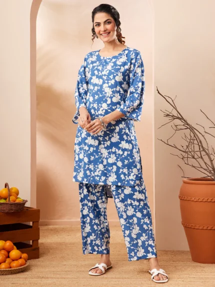 Shristi Blue Pure Cotton Floral Printed Straight Co-ord Set