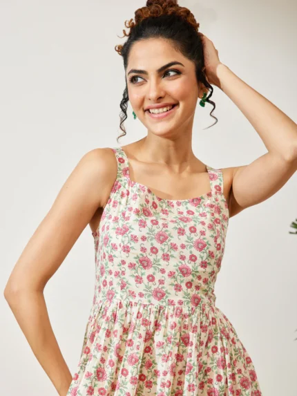 Sandy Off White Pure Cotton Floral Printed A-line Dress