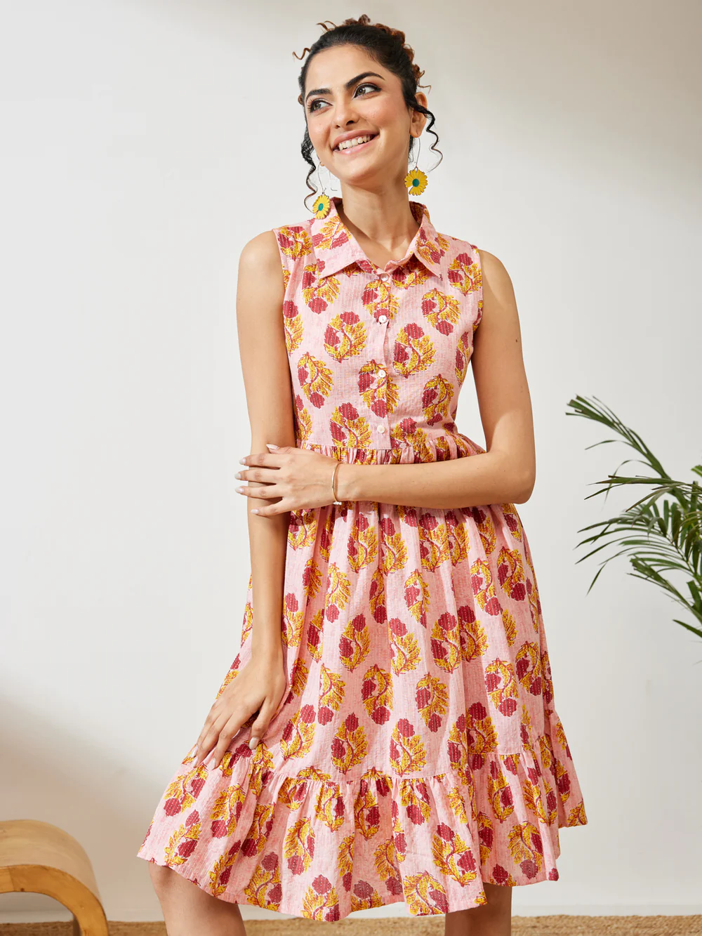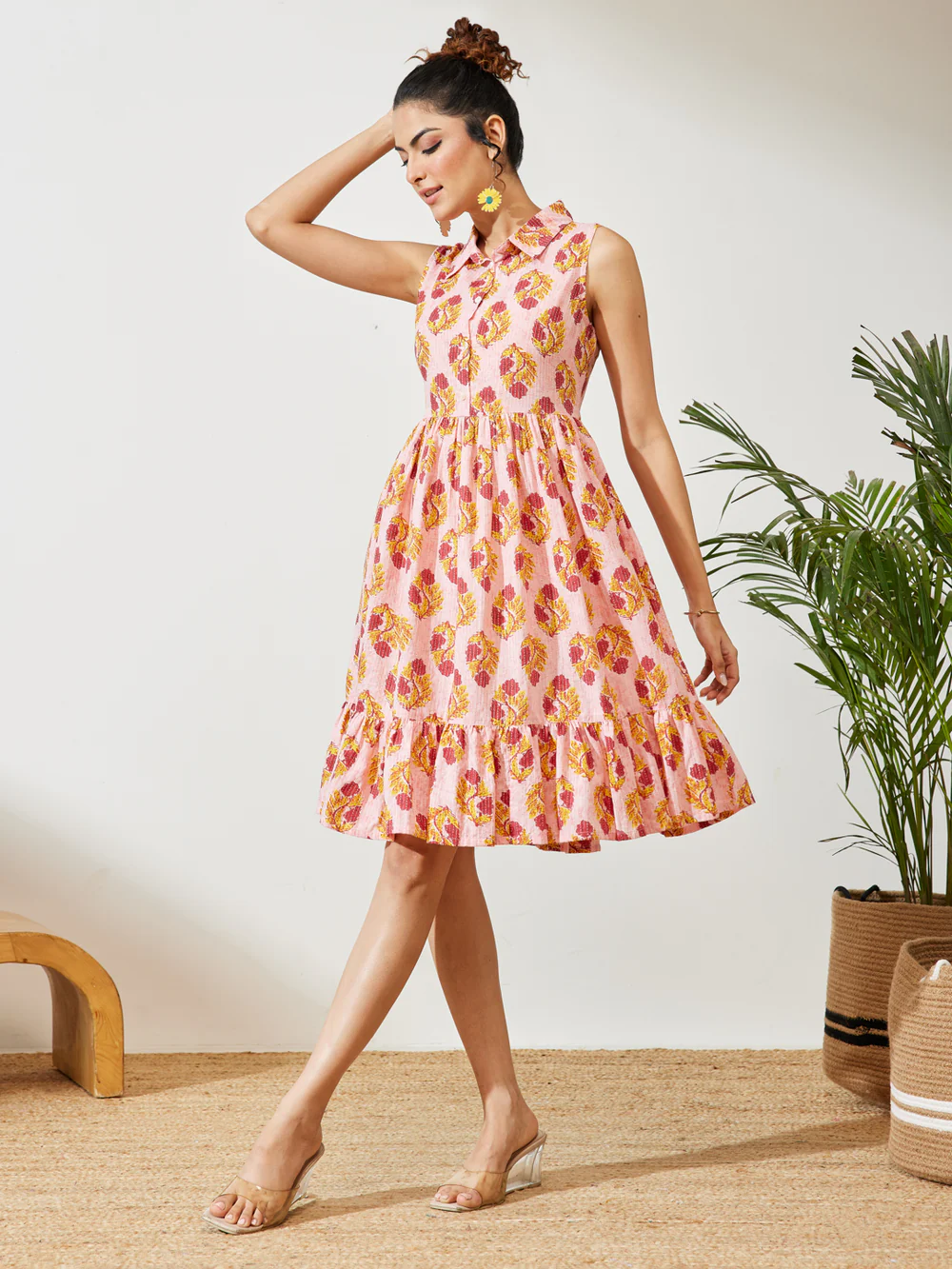 Hazel Pink Pure Cotton Floral Printed Fit & Flare Dress