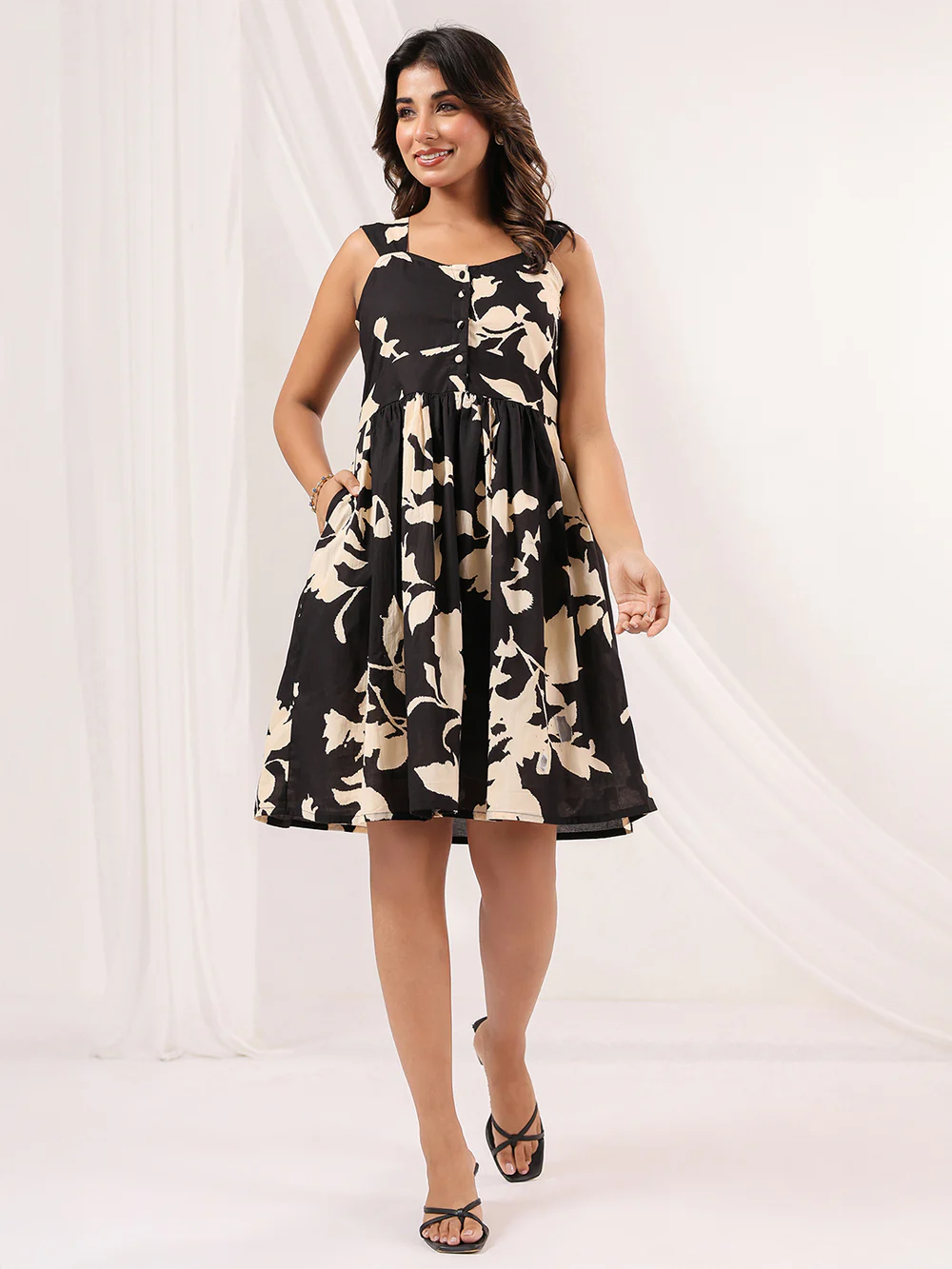 Melody Black & Cream Pure Cotton Floral Printed Fit & Flare Dress